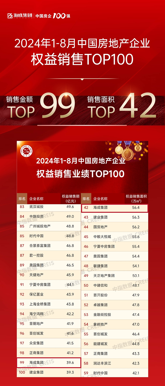市场规模继续收窄,海成深耕川渝,保持稳健发展。在中指研究院发布的全国房地产企业2024年1-8月销售业绩排行榜中,位列全国房企销售金额TOP109、销售面积TOP52、权益销售金额TOP99、销售面积TOP42。