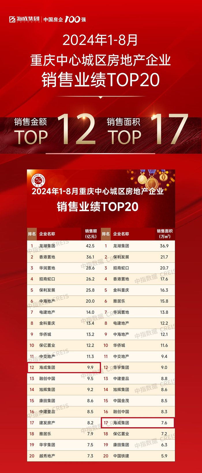 8月进入传统淡季,海成做精做细、业绩表现稳健。在中指研究院最新发布的1-8月大重庆房企销售排行榜中,位居销售金额第二名,销售面积第二名。