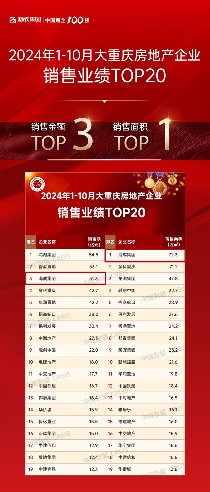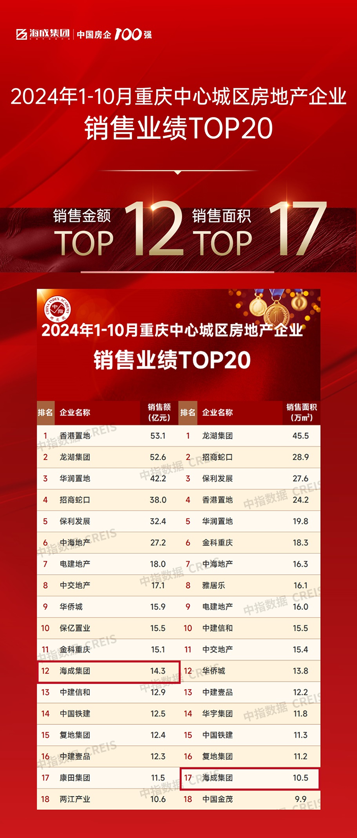 海成集团位居1-10月大重庆房企销售金额TOP3、销售面积TOP1;中心城区销售金额TOP12、销售面积TOP17