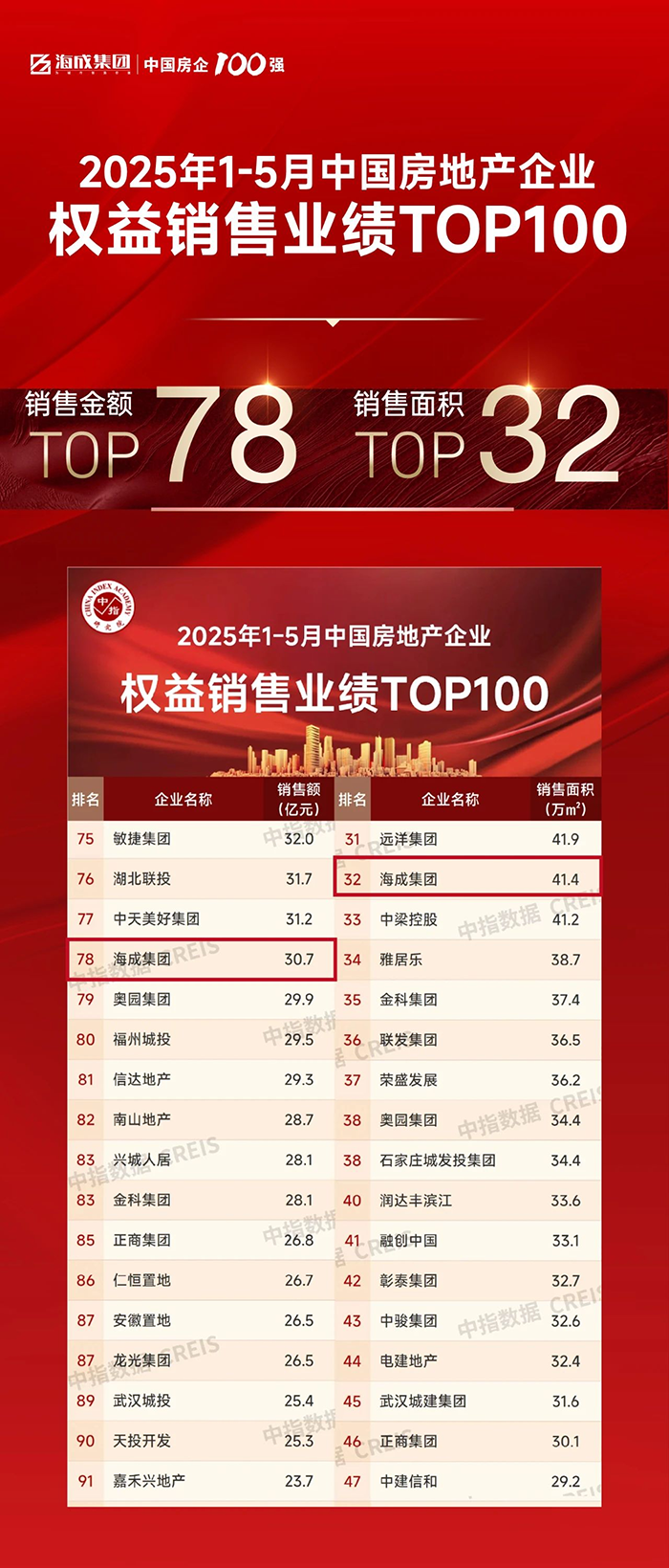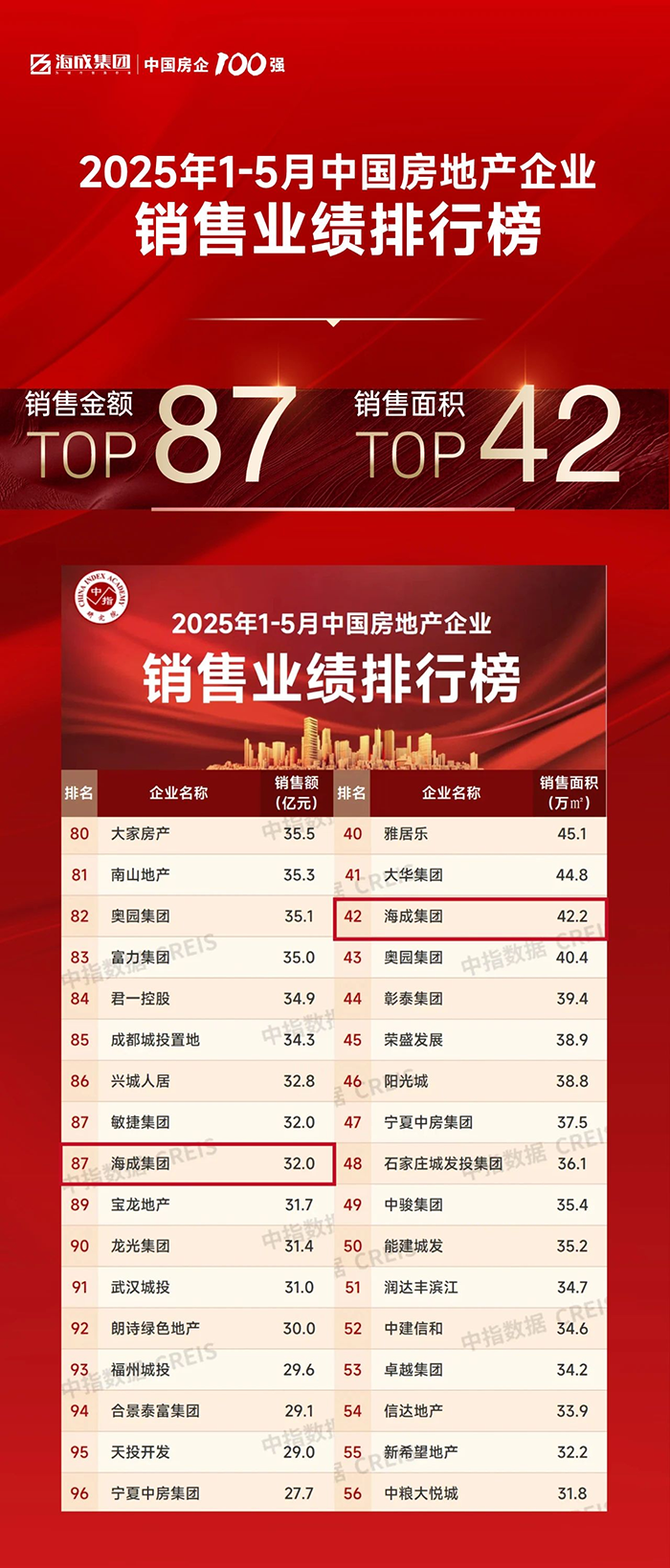 海成集团以深耕精研的战略定力,持续聚焦城市核芯地块优质土地,通过对产品力迭代升级与品质人居的创新焕新,在行业树立起了强有力的差异化优势。在中指研究院最新数据中,海成以32亿元的销售额,位列2025年1-5月全国房地产企业销售业绩榜第87名;以42.2万㎡的销售面积,位列2025年1-5月全国房地产企业销售业绩榜第42名。