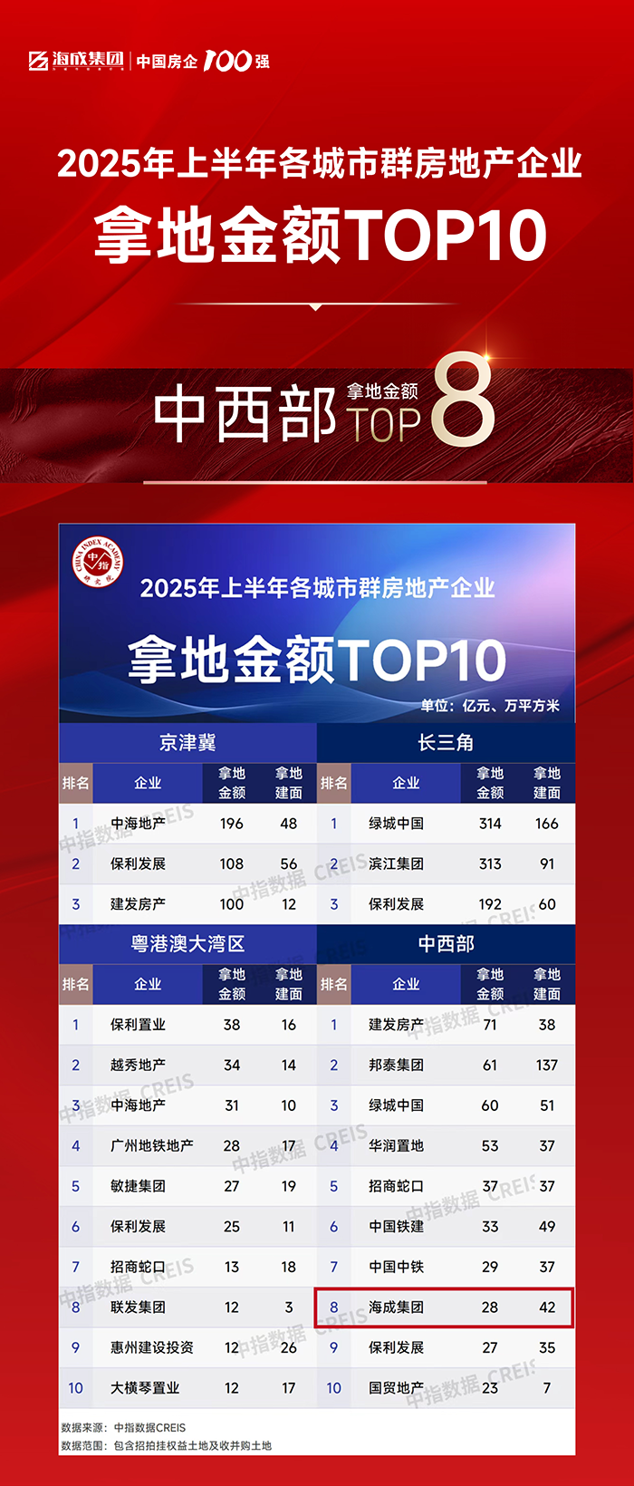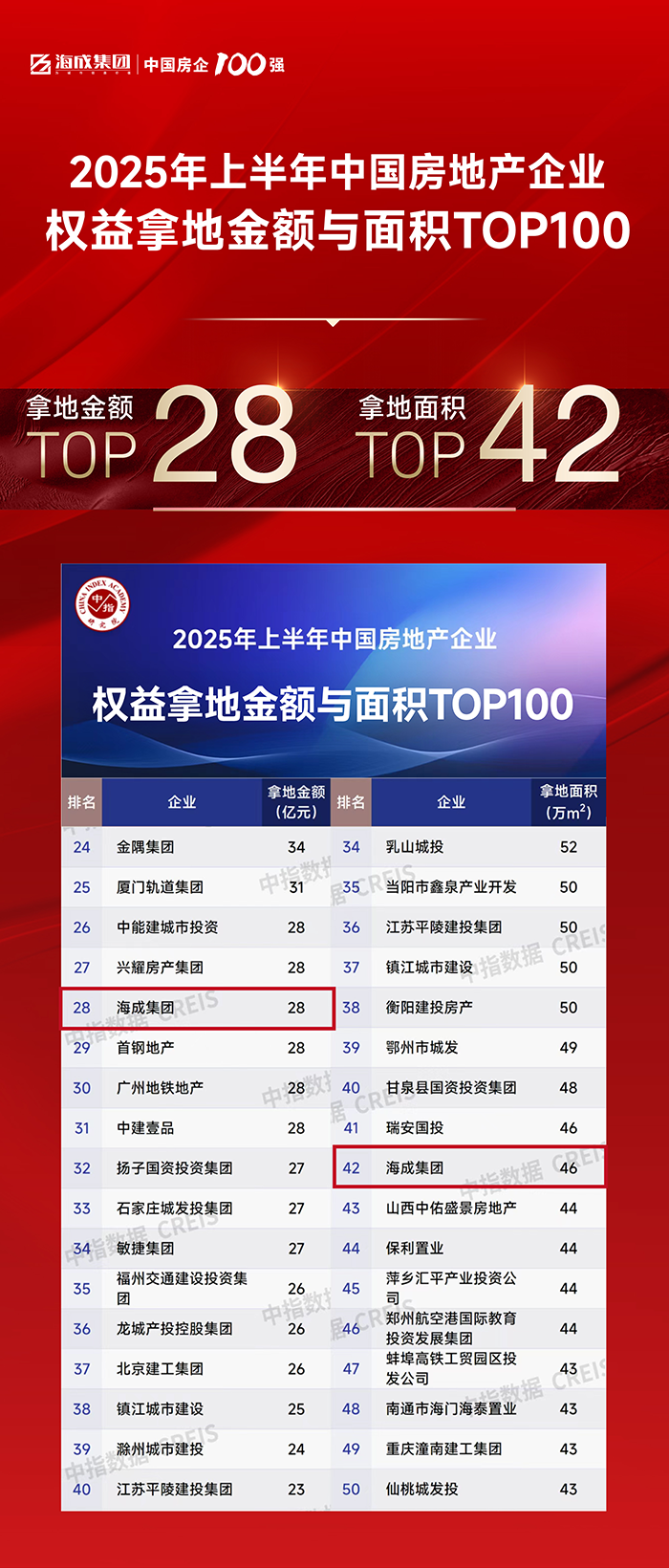 致远笃行 | 海成集团位居全国上半年房企拿地金额TOP28 & 拿地面积TOP42