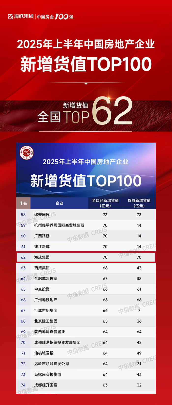 在中指研究院最新数据中,以28亿元的拿地金额、46万㎡的拿地面积,位列2025年上半年全国房地产企业权益拿地金额与面积排行榜拿地金额第28名,拿地面积第42名;新增货值70亿元,新增货值第62名。