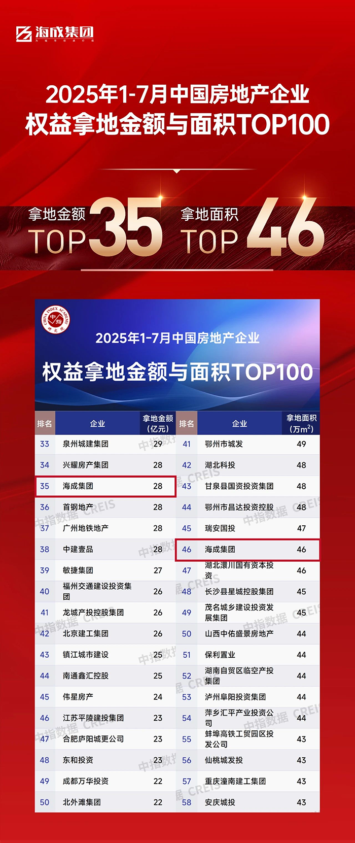 坚定笃行 | 海成集团位居全国1-7月房企拿地金额TOP35 & 拿地面积TOP46