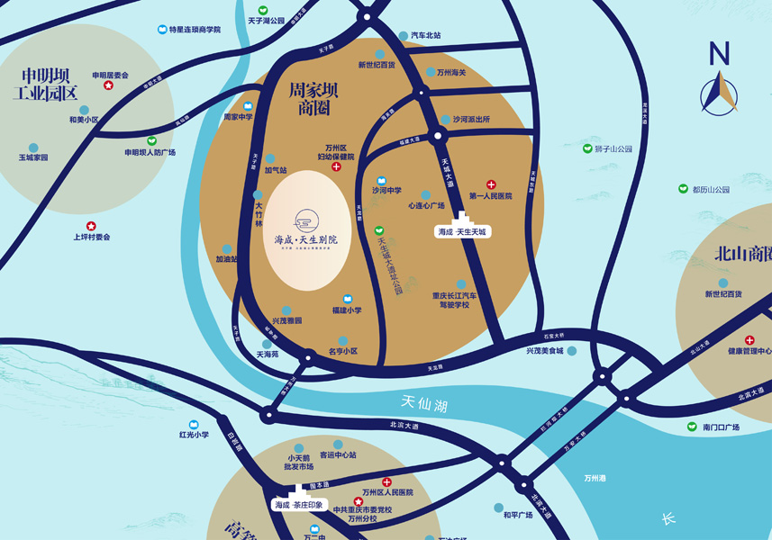 海成·天生别院——36万方美好生活家,位处北副城心商圈,坐享天子路、天龙路等成熟交通配套,天生城公园、狮子山公园、妇幼保健院环布周围,臻筑五维园林盛景,容积率低至2.0,绿化率高达30%,并为业主构筑全龄架空层,配置丰富运动设施,是万州少有的城央舒适低密住区。